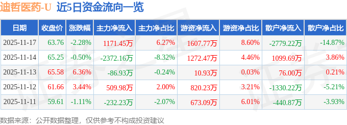 证券之星消息,截至2025年11月17日收盘,迪哲医药(688192)报收于63.76元,下跌2.28%,换手率0.65%,成交量2.93万手,成交额1.87亿元。
