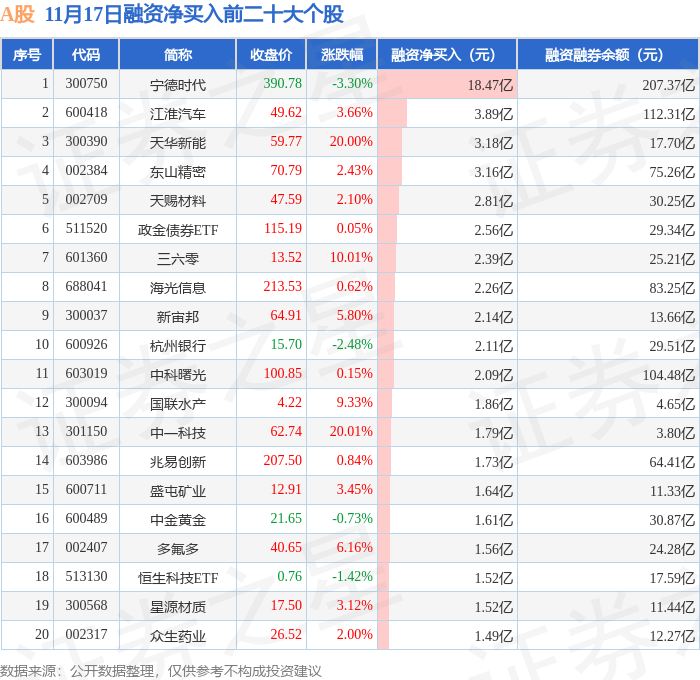 A股融资净买入前三分别为:宁德时代(300750)融资净买入18.47亿元、江淮汽车(600418)融资净买入3.89亿元、天华新能(300390)融资净买入3.18亿元,前20具体见下表: