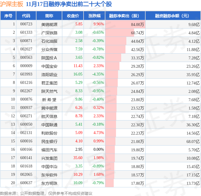 沪深主板融券净卖出前三分别为:美锦能源(000723)融券净卖出84万股、广深铁路(601333)融券净卖出60.74万股、石化油服(600871)融券净卖出44.04万股,前20具体见下表: