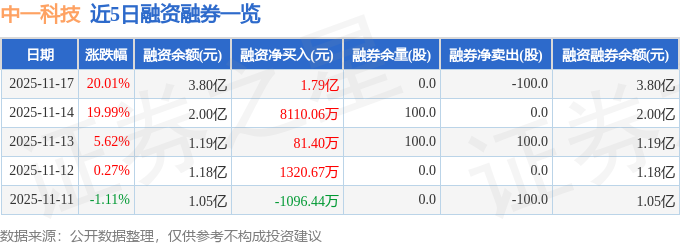 中一科技融资融券信息显示,融资方面,当日融资买入3.07亿元,融资偿还1.28亿元,融资净买入1.79亿元,净买入额两市排名第13,连续3日净买入累计2.61亿元。融券方面,融券卖出0.0股,融券偿还100.0股,融券余量0.0股,融券余额0.0万元。融资融券余额3.8亿元。