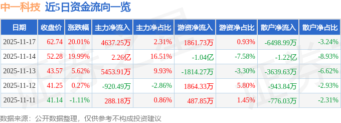 证券之星消息,截至2025年11月17日收盘,中一科技(301150)报收于62.74元,上涨20.01%,已连续涨停2天,换手率15.42%,成交量34.33万手,成交额20.07亿元。