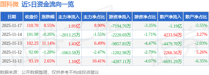证券之星消息,截至2025年11月17日收盘,国科微(300672)报收于110.7元,上涨8.55%,换手率9.44%,成交量19.85万手,成交额21.45亿元。