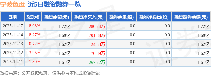 宁波色母融资融券信息显示,融资方面,当日融资买入3852.08万元,融资偿还3571.84万元,融资净买入280.24万元,连续3日净买入累计1006.45万元。融券方面,融券卖出0.0股,融券偿还0.0股,融券余量0.0股,融券余额0.0万元。融资融券余额1.72亿元。