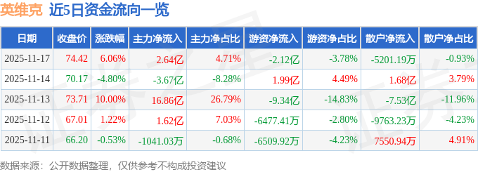 证券之星消息,截至2025年11月17日收盘,英维克(002837)报收于74.42元,上涨6.06%,换手率8.91%,成交量75.71万手,成交额56.09亿元。
