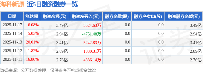 海科新源融资融券信息显示,融资方面,当日融资买入2.49亿元,融资偿还1.94亿元,融资净买入5524.63万元。融券方面,融券卖出0.0股,融券偿还0.0股,融券余量0.0股,融券余额0.0万元。融资融券余额3.49亿元。