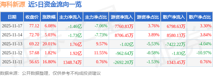 证券之星消息,截至2025年11月17日收盘,海科新源(301292)报收于77.12元,上涨6.08%,换手率33.22%,成交量28.26万手,成交额20.63亿元。