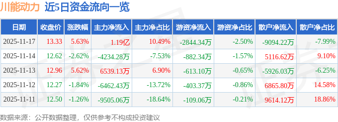 证券之星消息,截至2025年11月17日收盘,川能动力(000155)报收于13.33元,上涨5.63%,换手率4.66%,成交量85.95万手,成交额11.38亿元。