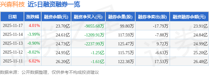 兴森科技融资融券信息显示,融资方面,当日融资买入1.4亿元,融资偿还2.31亿元,融资净偿还9055.68万元。融券方面,融券卖出1.78万股,融券偿还19.57万股,融券余量99.8万股,融券余额2096.8万元。融资融券余额23.91亿元。