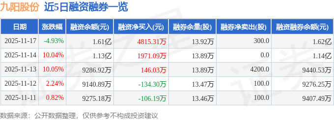 证券之星消息,截至2025年11月17日收盘,九阳股份(002242)报收于11.57元,下跌4.93%,换手率9.51%,成交量72.45万手,成交额8.76亿元。