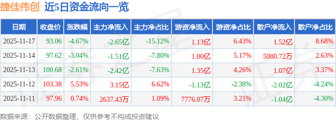 证券之星消息,截至2025年11月17日收盘,捷佳伟创(300724)报收于93.06元,下跌4.67%,换手率6.49%,成交量18.66万手,成交额17.52亿元。