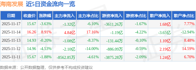 证券之星消息,截至2025年11月17日收盘,海南发展(002163)报收于15.67元,下跌3.63%,换手率17.08%,成交量137.25万手,成交额21.61亿元。