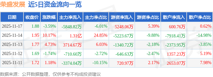 证券之星消息,截至2025年11月17日收盘,荣盛发展(002146)报收于1.88元,下跌3.59%,换手率13.01%,成交量509.06万手,成交额9.73亿元。