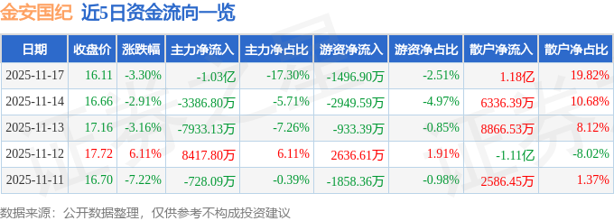 证券之星消息,截至2025年11月17日收盘,金安国纪(002636)报收于16.11元,下跌3.3%,换手率5.05%,成交量36.59万手,成交额5.96亿元。