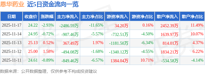 证券之星消息,截至2025年11月17日收盘,恩华药业(002262)报收于24.22元,下跌2.93%,换手率0.99%,成交量8.76万手,成交额2.13亿元。