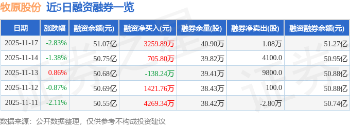 牧原股份融资融券信息显示,融资方面,当日融资买入2.38亿元,融资偿还2.05亿元,融资净买入3259.89万元。融券方面,融券卖出1.89万股,融券偿还8100.0股,融券余量40.9万股,融券余额1982.08万元。融资融券余额51.27亿元。