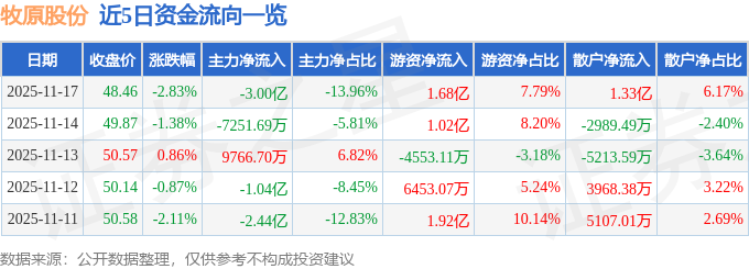 证券之星消息,截至2025年11月17日收盘,牧原股份(002714)报收于48.46元,下跌2.83%,换手率1.17%,成交量44.52万手,成交额21.52亿元。