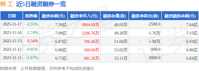 证券之星消息,截至2025年11月17日收盘,柳 工(000528)报收于11.08元,下跌2.55%,换手率1.86%,成交量37.77万手,成交额4.22亿元。