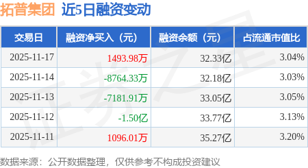 证券之星消息,11月17日,拓普集团(601689)融资买入1.6亿元,融资偿还1.45亿元,融资净买入1493.98万元,融资余额32.33亿元,近20个交易日中有11个交易日出现融资净买入。