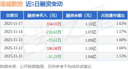 证券之星消息,11月17日,连城数控(920368)融资买入1007.37万元,融资偿还673.34万元,融资净买入334.03万元,融资余额1.11亿元。