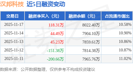 证券之星消息,11月17日,汉邦科技(688755)融资买入279.84万元,融资偿还161.54万元,融资净买入118.31万元,融资余额8022.4万元,近3个交易日已连续净买入累计208.02万元,近20个交易日中有13个交易日出现融资净买入。