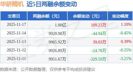 证券之星消息,11月17日,华研精机(301138)融资买入799.18万元,融资偿还689.95万元,融资净买入109.23万元,融资余额1.0亿元。