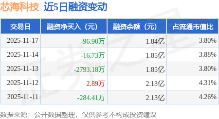 证券之星消息,11月17日,芯海科技(688595)融资买入556.89万元,融资偿还653.79万元,融资净卖出96.9万元,融资余额1.84亿元。