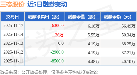 证券之星消息,11月17日,三态股份(301558)融资买入897.01万元,融资偿还1056.32万元,融资净卖出159.31万元,融资余额1.38亿元。