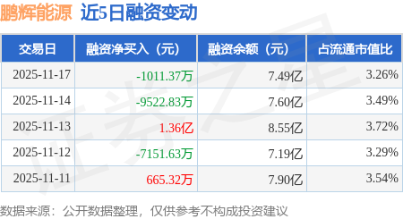 证券之星消息,11月17日,鹏辉能源(300438)融资买入2.33亿元,融资偿还2.43亿元,融资净卖出1011.37万元,融资余额7.49亿元。