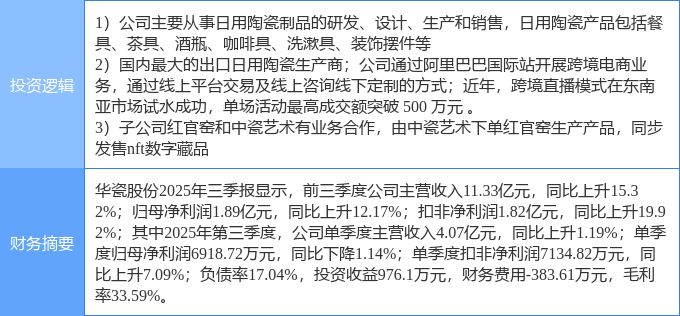证券之星消息,华瓷股份11月18日涨停收盘,收盘价20.61元。该股于9点34分涨停,2次打开涨停,截止收盘封单资金为6.17亿元,占其流通市值12.18%。