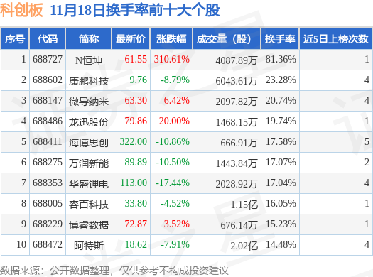 当日科创板换手率前10大个股中4只个股收涨,平均涨幅85.14%,其中N恒坤(688727)以换手率81.36%排第一,6只个股近5个交易日中多次上榜。
