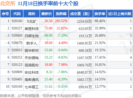 当日北交所换手率前10大个股中4只个股收涨,平均涨幅82.7%,其中N北矿(920160)以换手率88.46%排第一,4只个股近5个交易日中多次上榜。