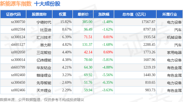 新能源车(399417)指数十大成份股详情如下: