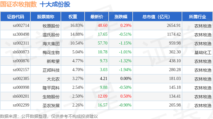 证券之星消息,11月18日,国证农牧(399435)指数报收于4061.89点,跌0.52%,成交116.25亿元,换手率2.34%。当日该指数成份股中,上涨的有8家,国联水产以6.16%的涨幅领涨,下跌的有31家,亚盛集团以2.41%的跌幅领跌。