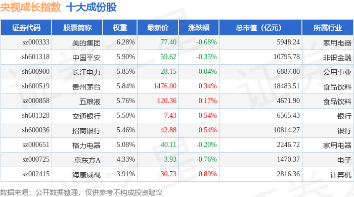 央视成长(399552)指数十大成份股详情如下: