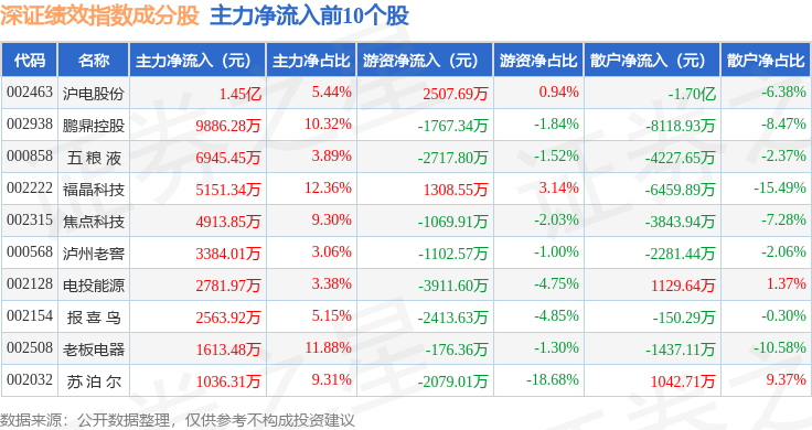 资金流向方面,深证绩效(399655)指数成份股当日主力资金净流出合计17.03亿元,游资资金净流入合计1.39亿元,散户资金净流入合计15.64亿元。成份股资金流向详情见下表: