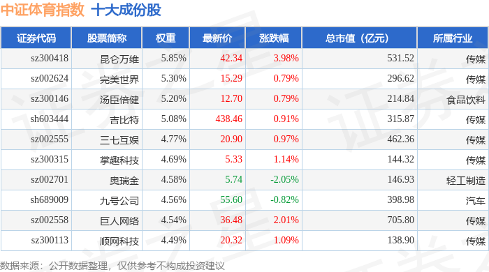 资金流向方面,中证体育(399804)指数成份股当日主力资金净流入合计4.58亿元,游资资金净流入合计1919.28万元,散户资金净流出合计4.78亿元。成份股资金流向详情见下表: