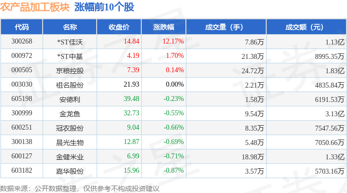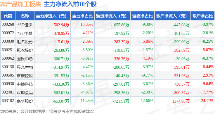 从资金流向上来看,当日农产品加工板块主力资金净流出2275.87万元,游资资金净流出528.91万元,散户资金净流入2804.78万元。农产品加工板块个股资金流向见下表: