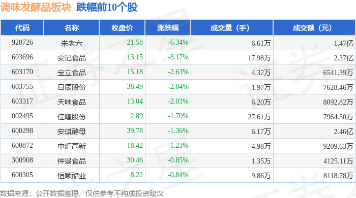 证券之星消息,11月18日调味发酵品板块较上一交易日下跌0.82%,朱老六领跌。当日上证指数报收于3939.81,下跌0.81%。深证成指报收于13080.49,下跌0.92%。调味发酵品板块个股涨跌见下表: