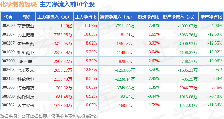 从资金流向上来看,当日化学制药板块主力资金净流出26.49亿元,游资资金净流入3.05亿元,散户资金净流入23.44亿元。化学制药板块个股资金流向见下表: