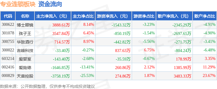 从资金流向上来看,当日专业连锁板块主力资金净流入2569.18万元,游资资金净流出1498.55万元,散户资金净流出1070.63万元。专业连锁板块个股资金流向见下表: