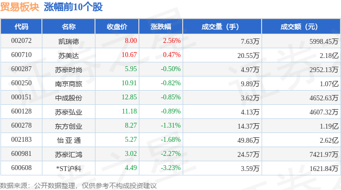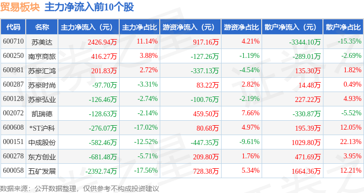 从资金流向上来看,当日贸易板块主力资金净流出4.76亿元,游资资金净流入4664.82万元,散户资金净流入4.29亿元。贸易板块个股资金流向见下表:
