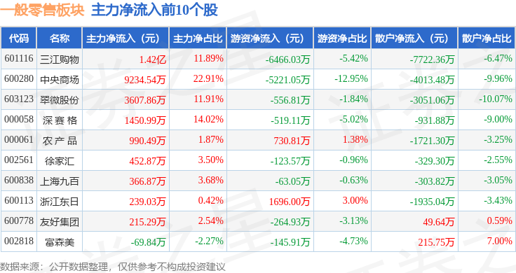 从资金流向上来看,当日一般零售板块主力资金净流出10.51亿元,游资资金净流出1.32亿元,散户资金净流入11.83亿元。一般零售板块个股资金流向见下表: