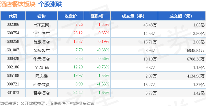 证券之星消息,11月18日酒店餐饮板块较上一交易日下跌0.21%,君亭酒店领跌。当日上证指数报收于3939.81,下跌0.81%。深证成指报收于13080.49,下跌0.92%。酒店餐饮板块个股涨跌见下表: