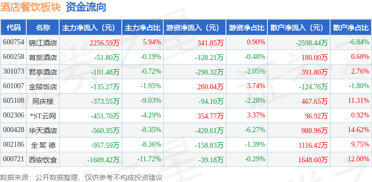 从资金流向上来看,当日酒店餐饮板块主力资金净流出1984.57万元,游资资金净流出174.59万元,散户资金净流入2159.16万元。酒店餐饮板块个股资金流向见下表: