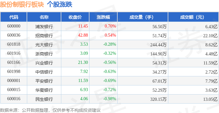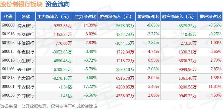 从资金流向上来看,当日股份制银行板块主力资金净流出3.94亿元,游资资金净流入8260.65万元,散户资金净流入3.12亿元。股份制银行板块个股资金流向见下表: