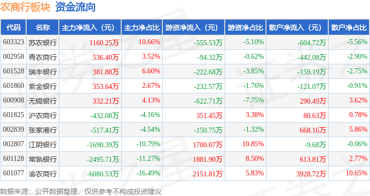 从资金流向上来看,当日农商行板块主力资金净流出8451.75万元,游资资金净流入4206.68万元,散户资金净流入4245.07万元。农商行板块个股资金流向见下表: