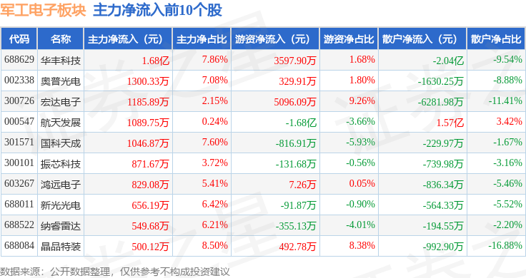 从资金流向上来看,当日军工电子板块主力资金净流出10.69亿元,游资资金净流入2.18亿元,散户资金净流入8.5亿元。军工电子板块个股资金流向见下表:
