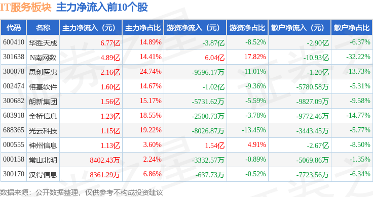 从资金流向上来看,当日IT服务板块主力资金净流入23.21亿元,游资资金净流入2.92亿元,散户资金净流出26.12亿元。IT服务板块个股资金流向见下表: