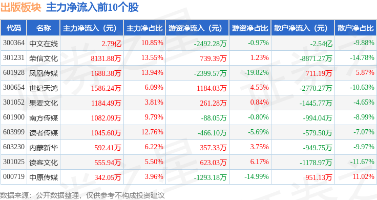 从资金流向上来看,当日出版板块主力资金净流入3.39亿元,游资资金净流出1295.58万元,散户资金净流出3.26亿元。出版板块个股资金流向见下表: