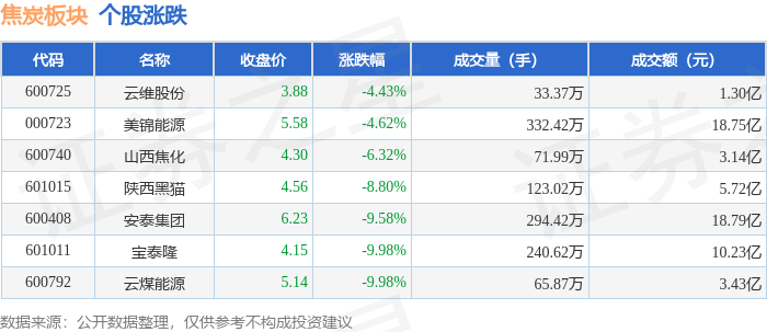证券之星消息,11月18日焦炭板块较上一交易日下跌6.99%,云煤能源领跌。当日上证指数报收于3939.81,下跌0.81%。深证成指报收于13080.49,下跌0.92%。焦炭板块个股涨跌见下表: